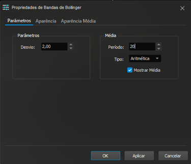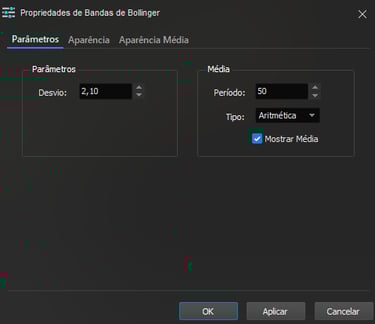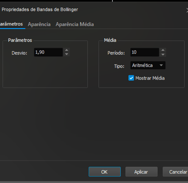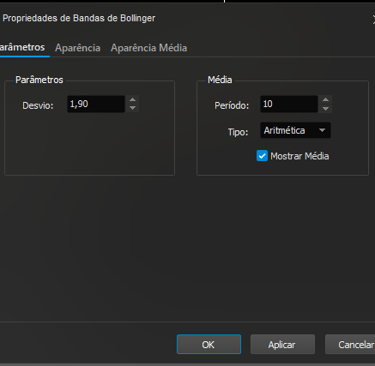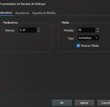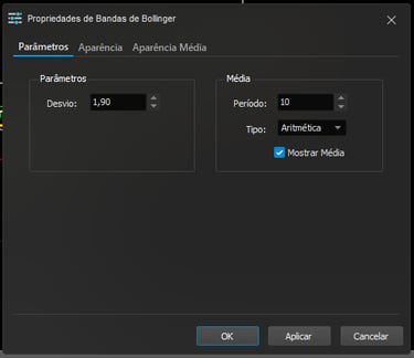 Jonh Bollinger, por meio do seu livro, Bollinger on Bollinger Bands, participa, de forma sugestiva, que, a depender do número de períodos, o desvio padrão em relação à média móvel pode ser ajustado. Para 10, 20 ou 50 períodos, o múltiplo de desvio padrão pode ser configurado para 1,9, 2,0 ou 2,1, respectivamente, conforme segue: