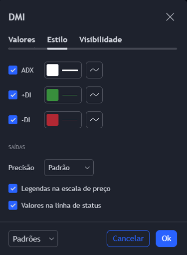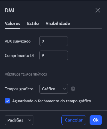 No entanto, antes de iniciarmos as observações, devemos nos ater que os indicadores a seguir, que constam nos gráficos em tempo real, são padronizados pelo Trandingview e, como sugestão, propomos o ajuste do DMI para 9 períodos, bem como, a critério individual, das cores de ADX, DI+ e DI-.
