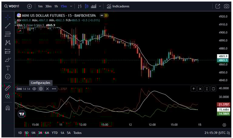 Pelo ADX, verifique a indicação de tendência ou de lateralização nos cenários de 15 minutos e de 5 minutos. O ADX crescente, com valor acima de 25, pode indicar a existência de tendência com mais força, por sua vez, os momentos em que a curva do ADX está decrescente, com valor abaixo de 32, ou em que a curva de ADX está por baixo das curvas de DI+ e DI-, pode haver ausência de tendência.