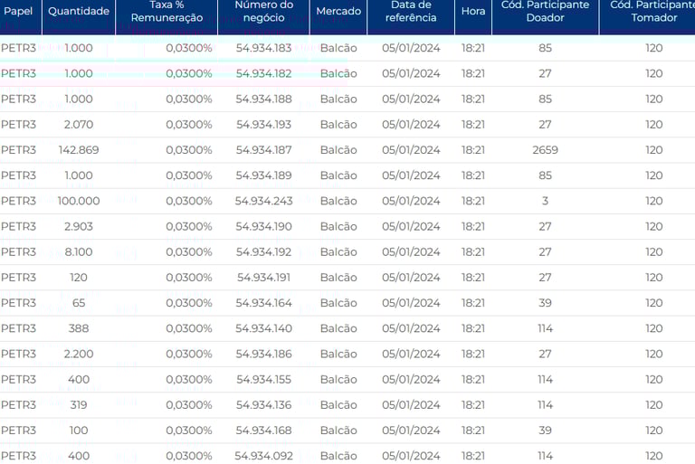 A B3 divulga Boletim Mensal de Empréstimo de Ativos em seu sítio eletrônico, www.b3.com.br/pt_br/produtos-e-servicos/emprestimo-de-ativos/boletim-mensal/, e relatório analítico por ativo, negócio a negócio, www.b3.com.br/pt_br/produtos-e-servicos/emprestimo-de-ativos/renda-variavel/negocio-a-negocio/.
