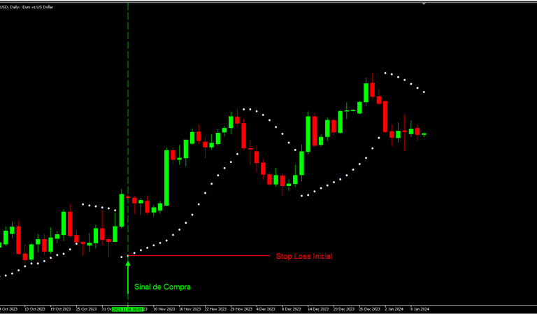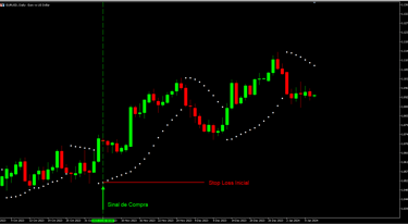 Em uma operação de compra, o investidor pode definir, inicialmente, o Stop Loss abaixo do ponto do Parabólico SAR mais recente. Isso significa que se a tendência de alta falhar e o preço cair abaixo do ponto do SAR, a posição é encerrada para limitar as perdas.