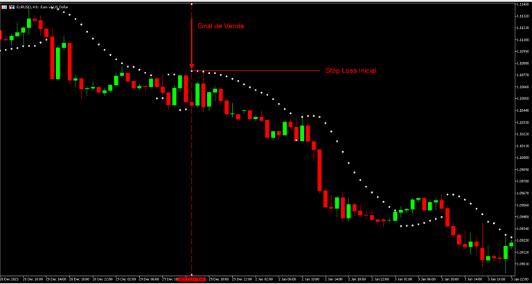 O Sinal de Venda ocorre quando o preço cruza abaixo do ponto do Parabólico SAR, sugerindo uma possível reversão da tendência para baixa, indicando aos investidores que considerem fechar posições longas ou abrir posições curtas (venda).